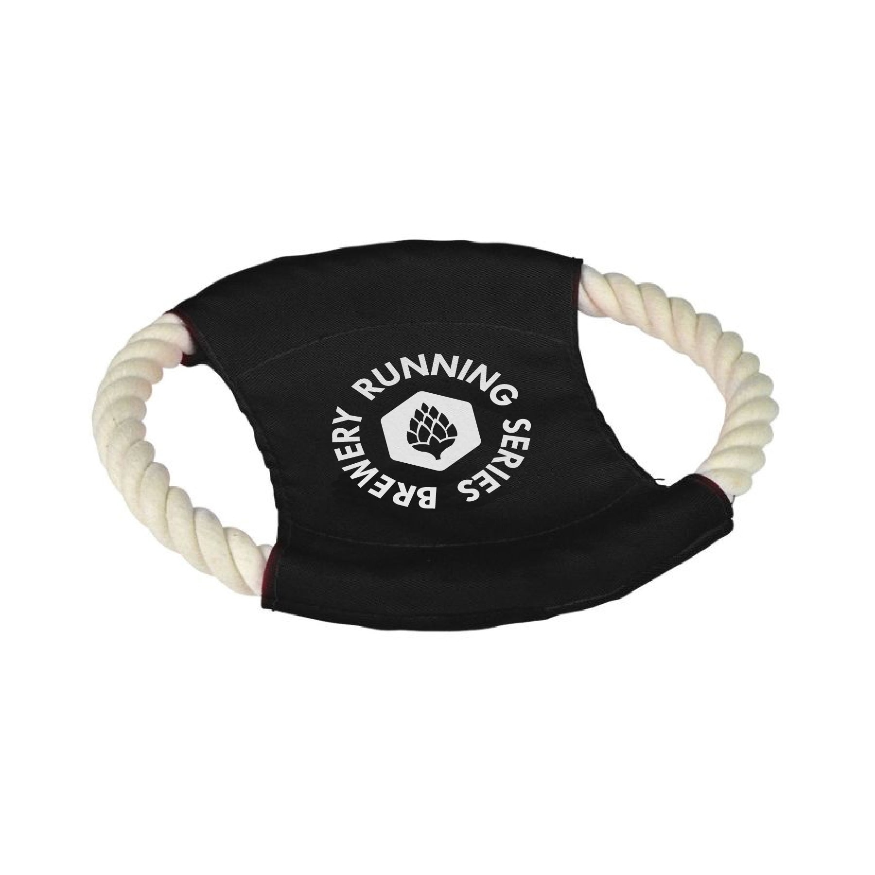 Fetch, tug, and play! This durable dog toy features a black fabric center and sturdy white rope handles on either side for a secure grip. Perfect for games of fetch, catch, and tug-of-war, promoting exercise and bonding with your best running buddy.