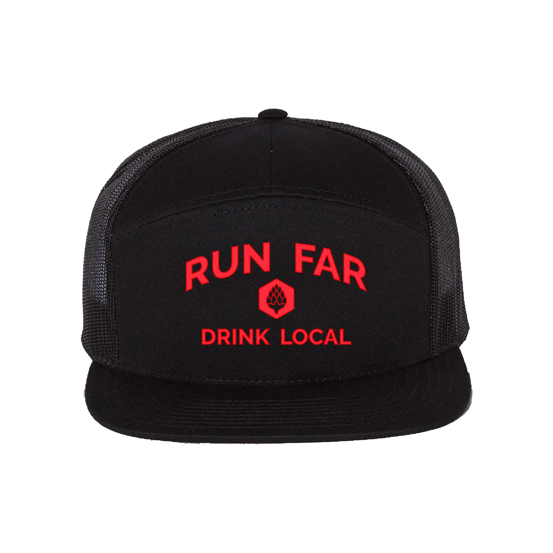 Rock your run and then reward yourself with this embroidered "Run Far Drink Local" 7-panel hat! In iconic Beer Run style, these hats feature a mix of eye-catching thread colors embroidered on classic black hats with a hop tag sewn on the back edge. Let everyone know what you're all about: hard work and good times!