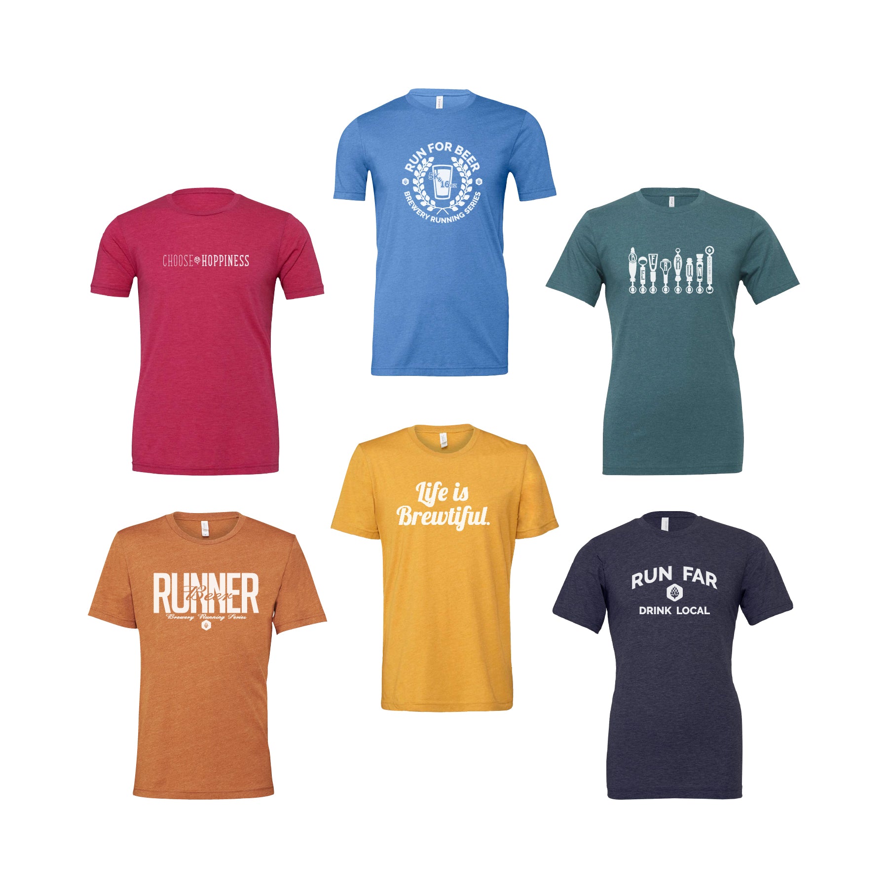 Get your hands on mix of classic Brewery Running Series designs printed on a variety of eye-catching tee colors! Designs may include 5k 16oz Wreath, Beer Runner, Choose Hoppiness, Life is Brewtiful, Run Far Drink Local, and Tap Handles. All designs are printed with vintage white ink on the front of Bella + Canvas 3001CVC Unisex Heather Tees.