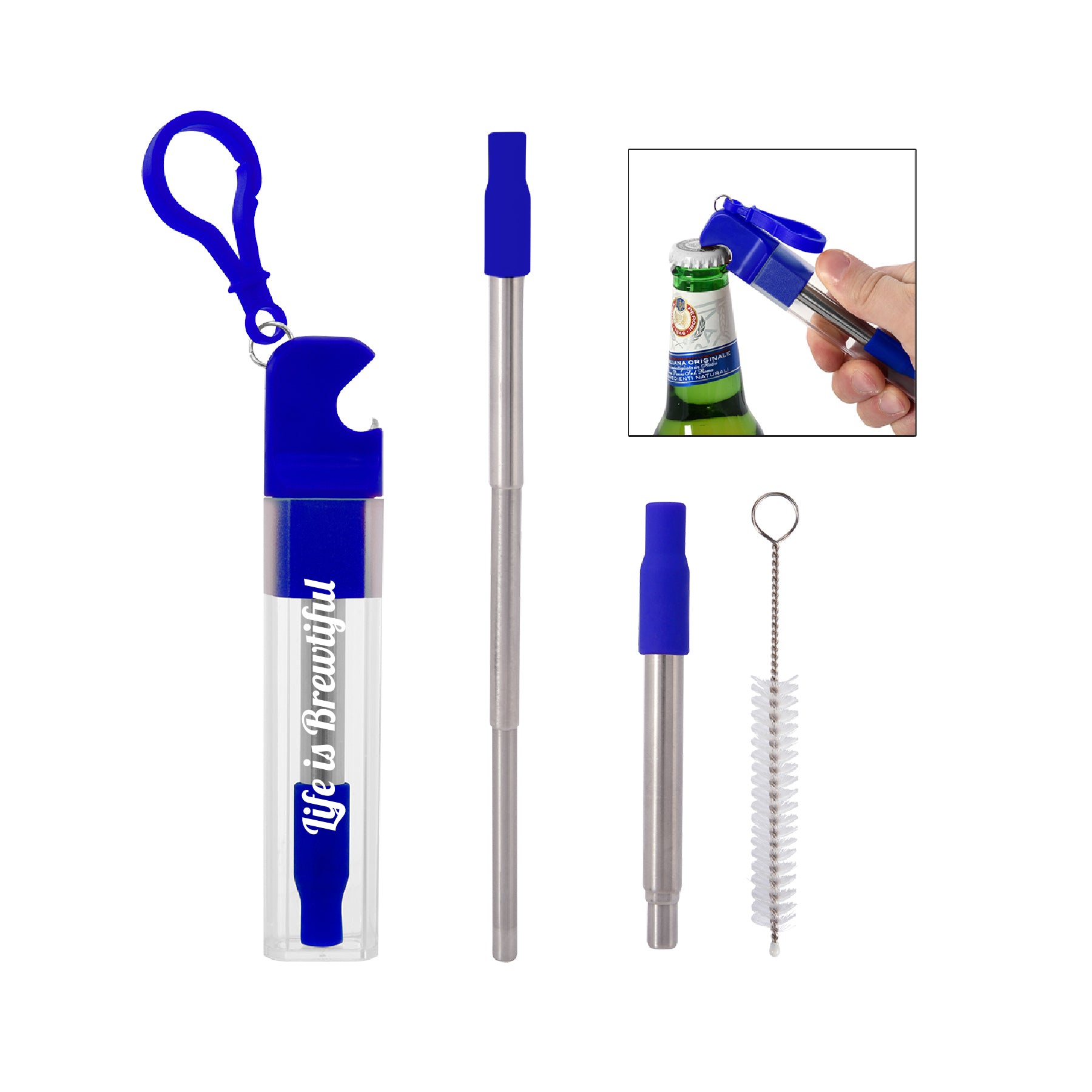 a telescopic metal straw (with a comfy blue tip!), a cleaning brush, AND a case that doubles as a bottle opener! Clip it to your bag with the handy blue carabiner. Perfect for ditching plastic and always being ready for a cold one. Cheers!